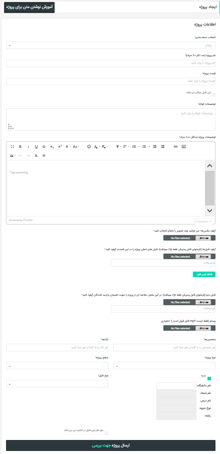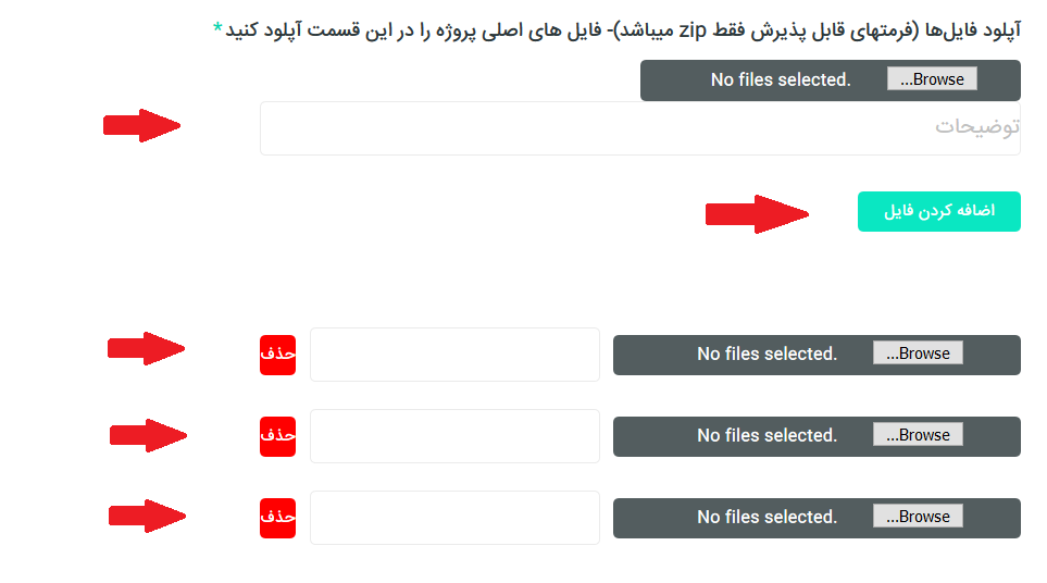 6-قسمت آپلود فایل ها برای آپلود فایل یا فایل های اصلی پروژه که قصد فروش آن را دارید می باشد که کاربران بعد از پرداخت مبلغ پروژه می توانند دانلود کنند.