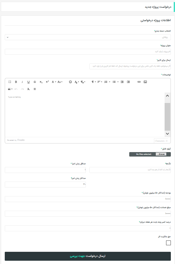 درصورتی که شما برای انجام پروژه خودبه افراد و یا تیم حرفه ای نیاز دارید در این بخش می توانید در محیطی امن و باشرایط ویژه درخواست خود را ثبت نمایید.