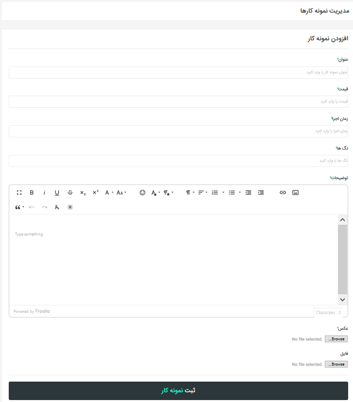 در این بخش نمونه کارها و توانایی های خود را در انجام کارها برای نمایش به بازدیدکنندگان سایت ثبت نمایید. بازدیدکنندگان که نیاز توانایی شما برای انجام پروژه های خود دارند می توانند از بین نمونه کارهای انتخاب کنند و برای آن تخصص شما درخواست پروژه در سایت ثبت نمایید.