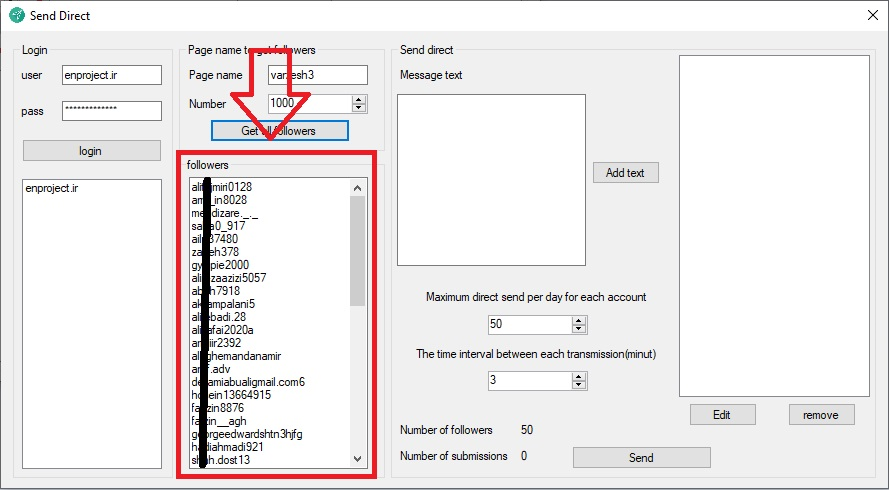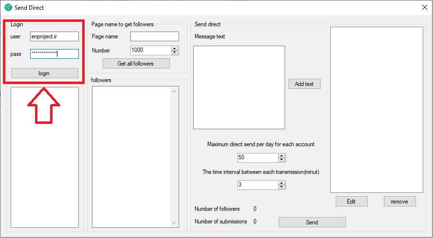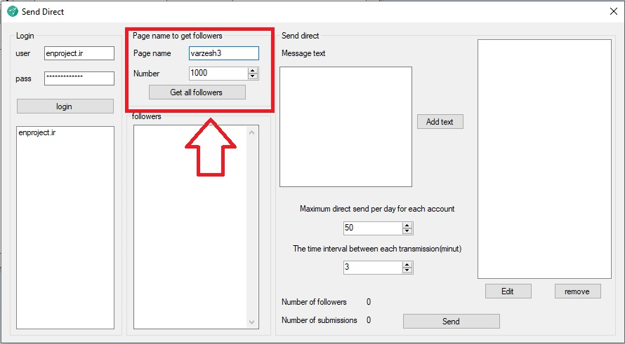به وسیله این نرم افزار با یک بار هزینه کردن می توانید به تمام فالوورهای هر پیج اینستاگرام دایرکت ارسال کنید. همچنین می توانید لیست کاربران مدنظر خود را ثبت نمایید و برای آن ها پیام ارسال کنید. این نرم افزار به شما این قابلیت را می دهد id کاربران هر page را ذخیره نمایید.