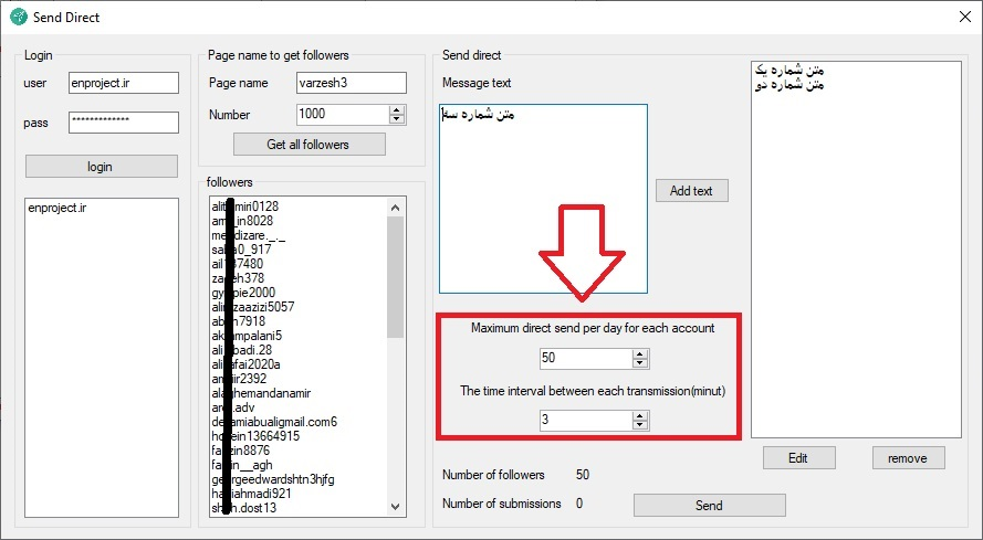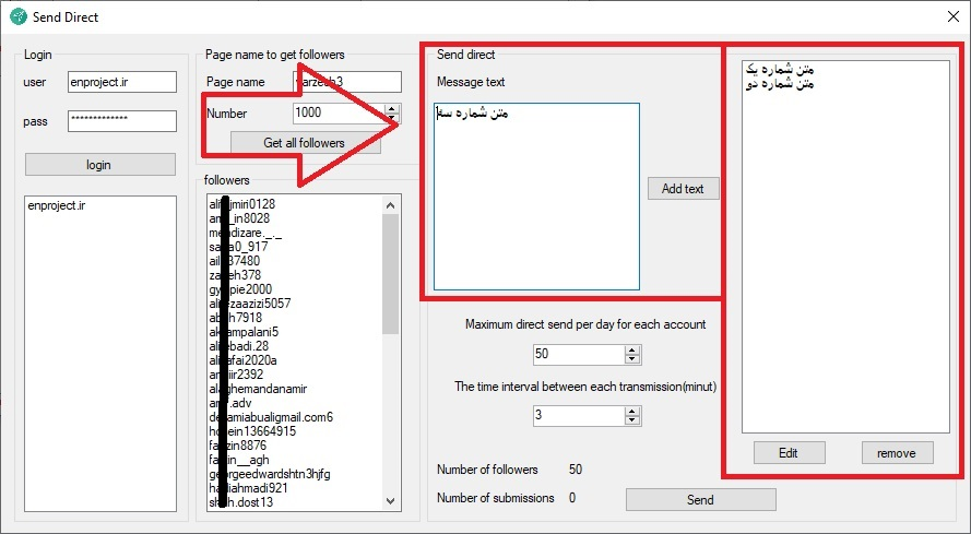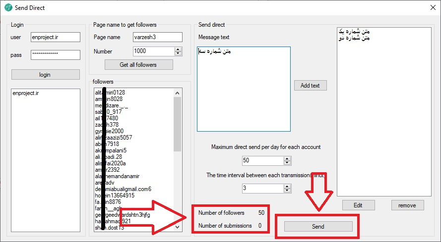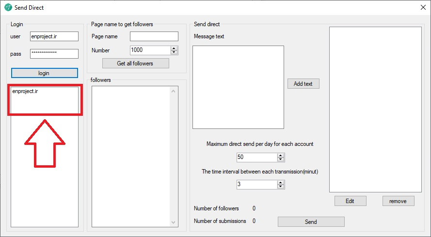 برای شروع طبق تصویر زیر نام های کاربری خود را که میخواهید توسط آن ها پیام ارسال شود را در نرم افزار ثبت کنید.