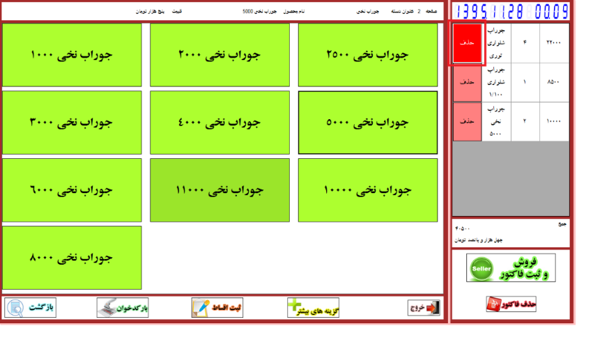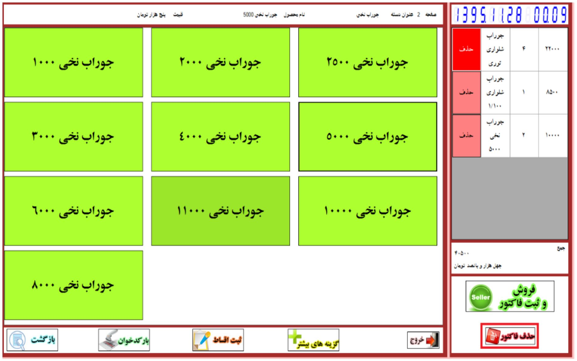 برای حذف کالای انتخاب شده در کادر سمت راست با هر بار کلیک گزینه حذف کنار نام محصول یک عدد از آن محصول در فاکتور کم می شود.