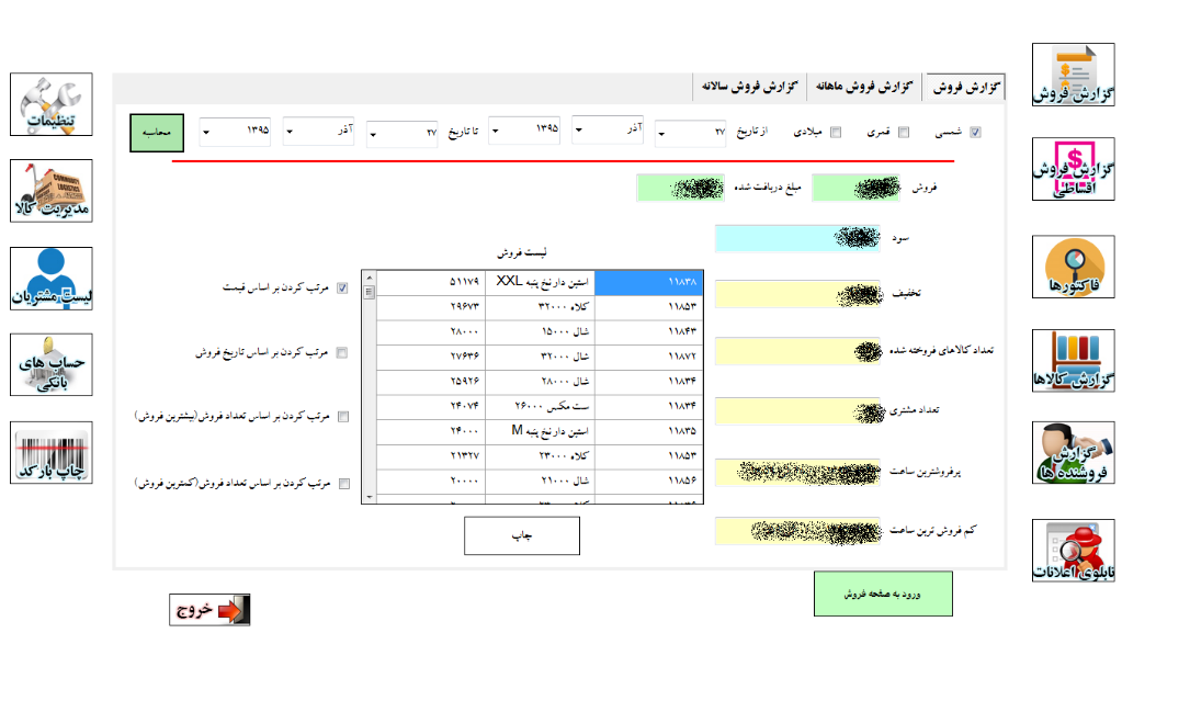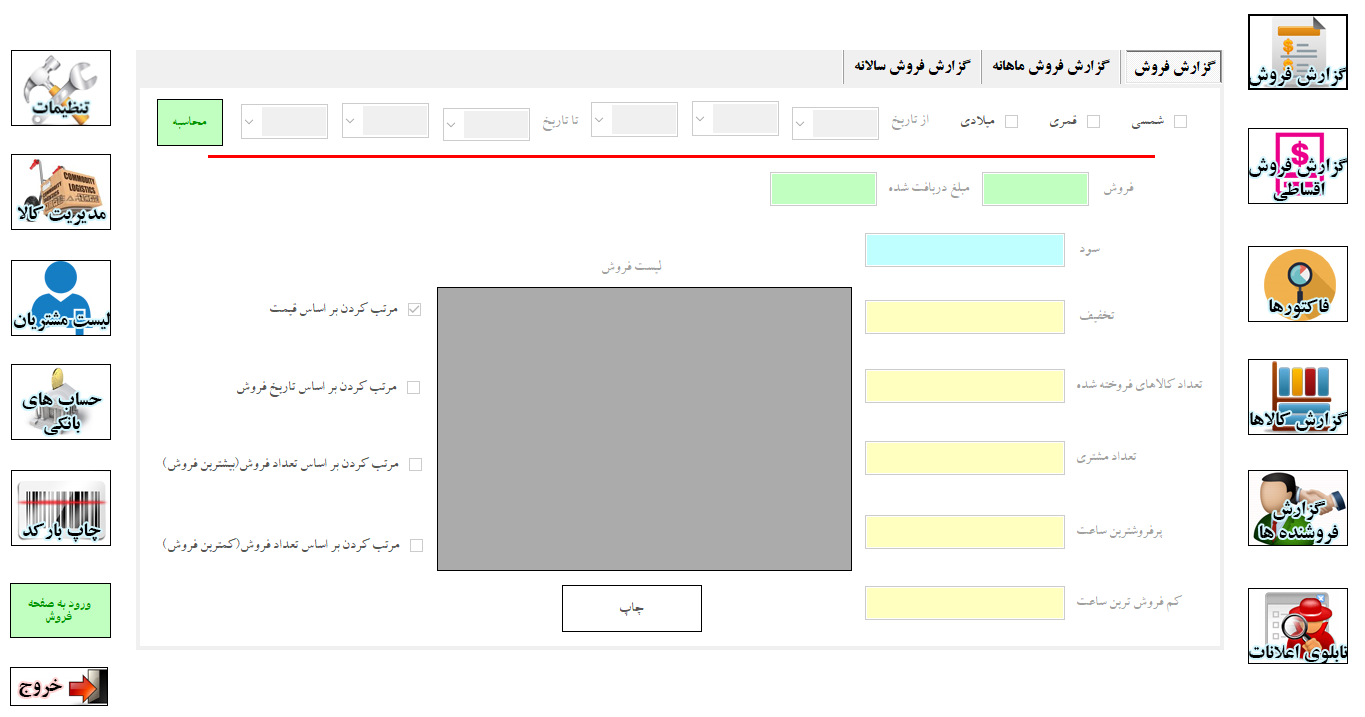 در این قسمت می توان گزارش فروش روزانه در بازه های مشخص و یا گزارش فروش ماهانه و گزارش فروش سالانه همانند شکل دریافت نمود. در این قسمت میزان فروش، مبلغ دریافت شده، سود، میزان تخفیف داده شده، تعداد کالاهای فروخته شده، تعداد مشتریان، پرفروش ترین ساعت و کم فروش ترین ساعت اعلام شود همچنین در قسمت لیست فروش می توان عناوین کالاهای فروخته شده براساس قیمت یا تاریخ فروش و یا تعداد فروش مرتب کرد.