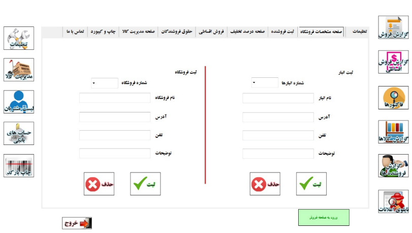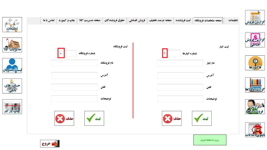 بعد از ثبت انبار یا فروشگاه ، برای ویرایش مشخصات و یا حذف آن می توانید در قسمت شماره انبار یا شماره فروشگاه آن انبار یا فروشگاه را انتخاب نمایید و برای ویرایش بعد از تغییرات مجدد دکمه ثبت را بزنید و یا برای حذف آن دکمه حذف را بزنید.