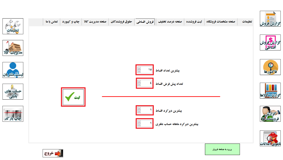 در این صفحه تنظیمات مربوط به بیشترین تعداد اقساط که فروشنده زمان فروش می تواند به مشتری بدهد و تعداد پیش فرض اقساط برای راحتی کار فروشنده در زمان فروش بیشترین دیرکرد اقساط و بیشترین دیرکرد ماهانه حساب دفتری برای گزارش دادن در قسمت گزارش فروش اقساطی وارد نمایید و سپس گزینه ثبت را کلیک نمایید.