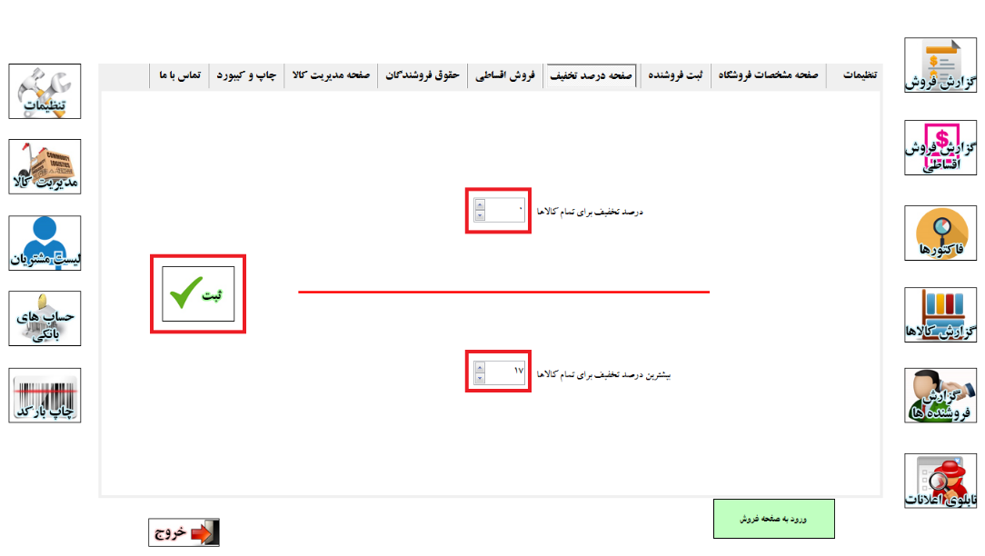 وارد قسمت صفحه درصد تخفیف شوید. بیشترین در صد تخفیفی که برای هر کالا فروشنده می تواند بدهد وارد کنید و همچنین درصد تخفیف برای تمام کالا را وارد کنید. این گزینه برای راحتی کار در قسمت ثبت کالا می باشد و در قسمت ثبت کالا این مقدار قابل تغییر می باشد و فقط یک درصد پیش فرض برای قسمت ثبت کالا می باشد. برای ذخیره حتما گزینه ثبت را بزنید.