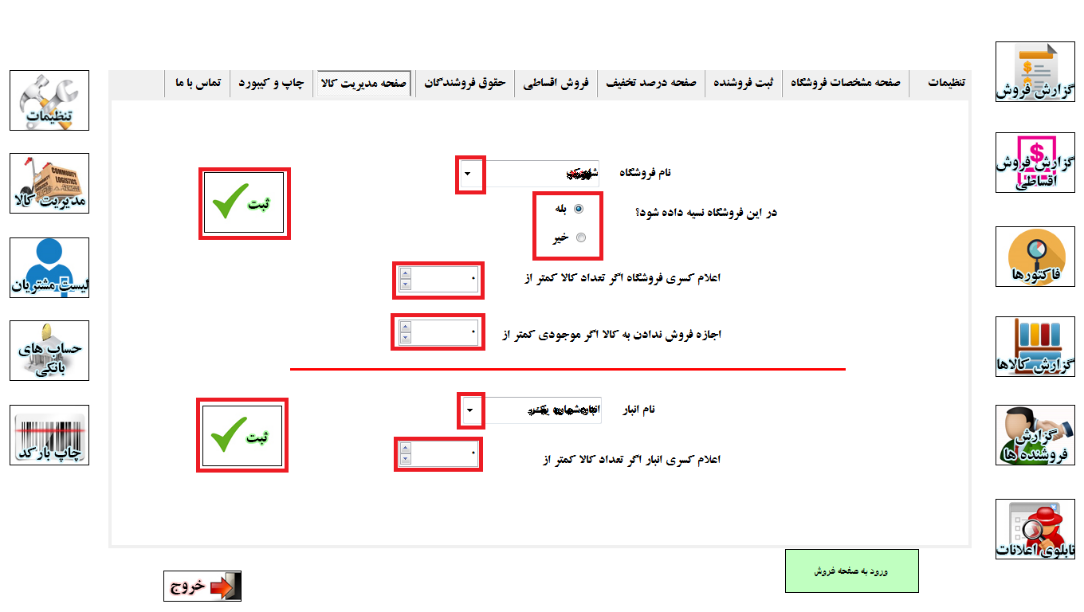در این صفحه تنظیمات نشان داده شده در تصویر را می توان برای هر فروشگاه یا انبار ثبت نمود. در این قسمت می توان مشخص نمود که اگر تعداد کالا در فروشگاه کمتر از مقداری مشخص شد دیگر به فروشنده اجازه فروش آن محصول را ندهد تا دوباره مقدار آن در فروشگاه افزایش یابد. گزینه های این قسمت به صورت پیش فرض می باشند و برای راحتی این کار در قسمت ثبت کالا می باشند و در قسمت ثبت کالا می توان برای هر کالا این مقادیر را تغییر داد.