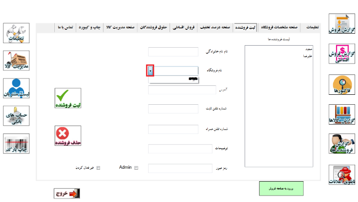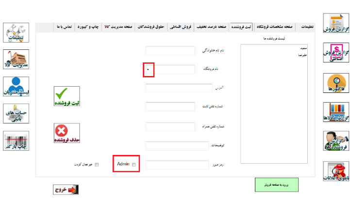 با فعال کردن گزینه admin کاربر می تواند به قسمت تنظیمات و گزارشات دسترسی داشته باشد. در این صفحه نام فروشگاه را می بایست با انتخاب قسمت مشخص شده بر روی تصویر انتخاب نمود. با انتخاب گزینه غیر فعال کردن دسترسی کاربر از نرم افزار قطع می شود. لازم به ذکر است کلمه عبور برای ورود به نرم افزار همان رمز عبور می باشد. جهت ویرایش و حذف در قسمت لیست فروشنده ها با انتخاب نام هر کدام از فروشنده ها می توان جهت ویرایش ، گزینه ثبت فروشنده و جهت حذف گزینه حذف فروشنده را انتخاب نمود.