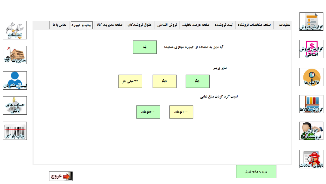 در این صفحه تنظیمات استفاده از کیبورد ، سایز پرینتر، گرد کردن مبلغ نهایی ثبت می شود. با انتخاب گرد کردن مبلغ نهایی بر روی دو گزینه 100 یا 500 مبلغ نهایی کالا نسبت به 100 یا 500 گرد می شود.