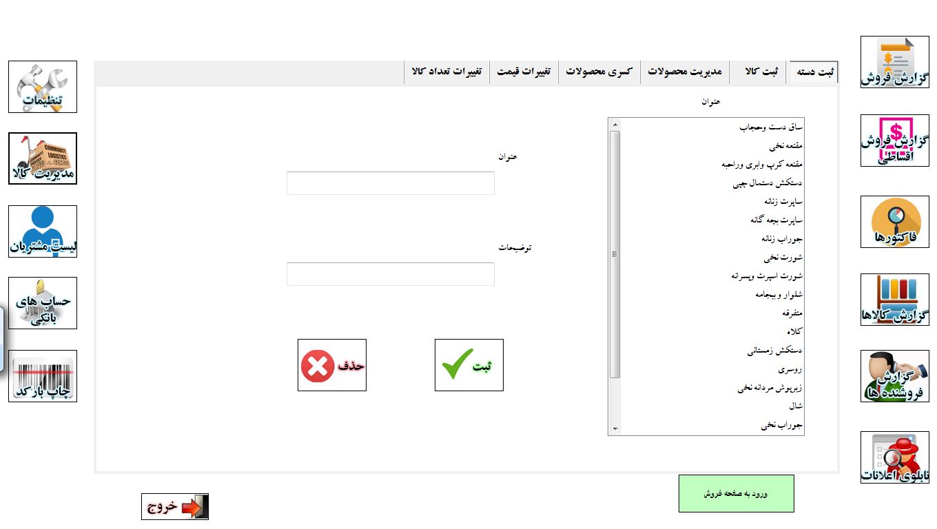 می بایست کالاهای موجود برای فروش را به دسته های مختلف تقسیم نمود. برای ویرایش و یا حذف یک دسته با انتخاب نام دسته در قسمت عنوان جهت ویرایش مجدد گزینه ویرایش و برای حذف گزینه حذف را کلیک نمایید.
