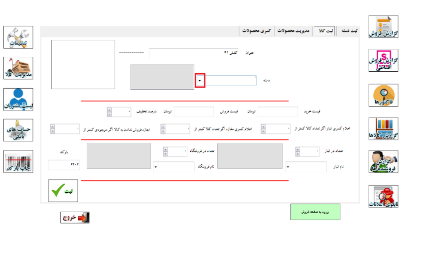 در این صفحه محصولات فروشگاه را در نرم افزار ثبت می کنید. برای این کار در قسمت عنوان نام محصول را وارد می کنید. در قسمت دسته با انتخاب فلش مشخص شده در شکل، دسته محصول را انتخاب می کنید.