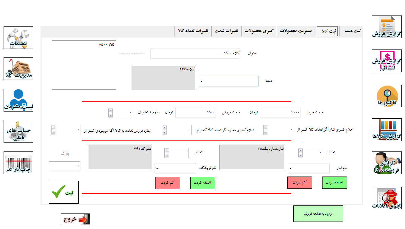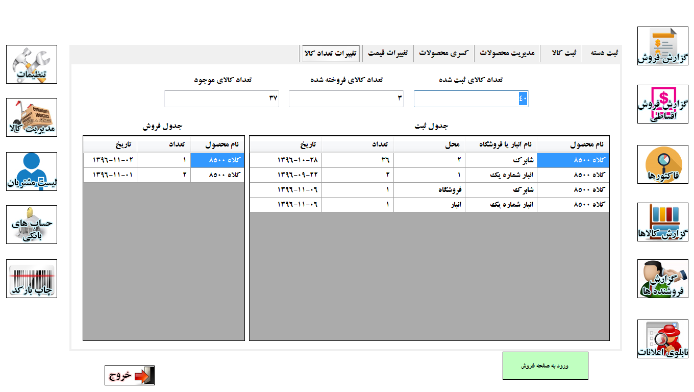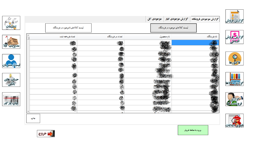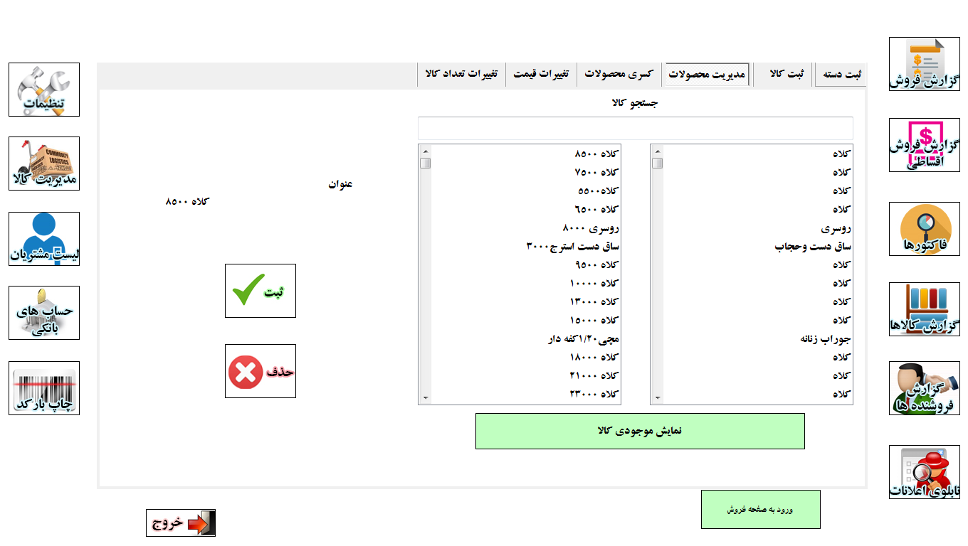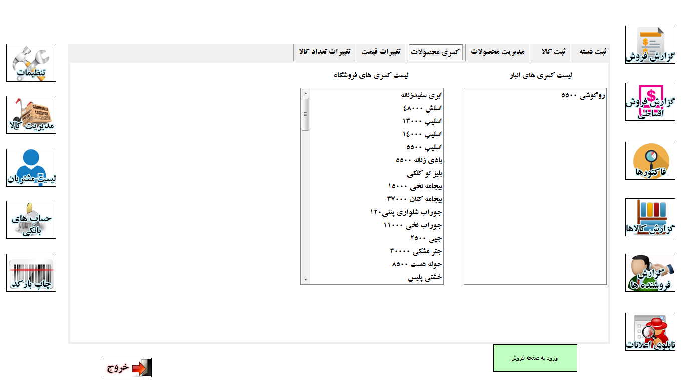 در این قسمت می توان کالاهای موجود در فروشگاه یا انبار را مشخص نمود همچنین لیست کالاهایی که قبلا در فروشگاه یا انبار بوده است و الان دیگر موجود نمی باشد نمایش داد.