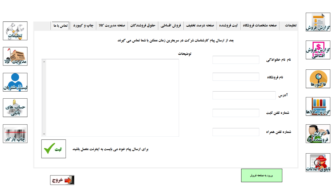 در صورت هرگونه مشکل و یا سؤال در مورد نرم افزار پیغام خود را به وسیله این صفحه برای کارشناسان شرکت ارسال نمایید. لازم به ذکر است برای ارسال می بایست به اینترنت متصل باشید.