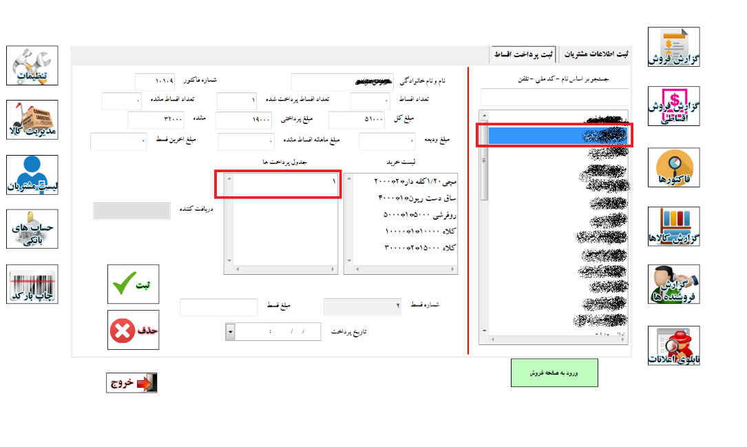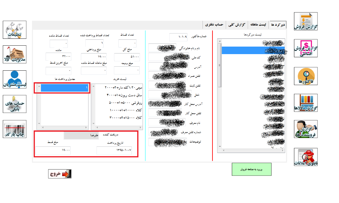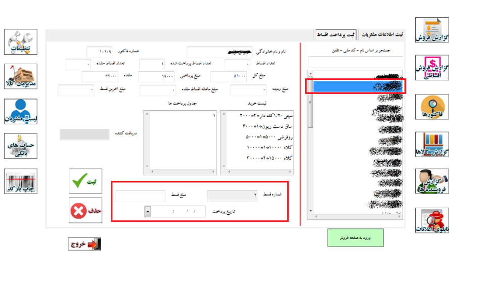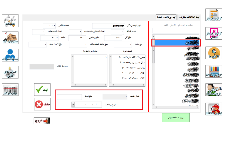 در این صفحه با کلیک کردن بر روی نام مشتریان مشخصات فاکتور در قسمت مشخص شده در تصویر آورده می شود. برای ثبت قسط در قسمت مبلغ قسط، مبلغ قسط را وارد می کنید و در قسمت تاریخ پرداخت، تاریخ پرداخت قسط را وارد می کنید.
