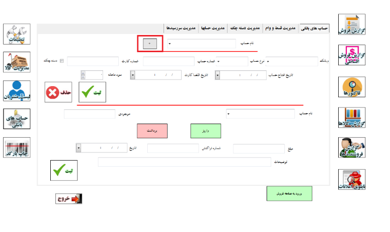 در این قسمت می توان حساب های بانکی خود را مدیریت نمود. همچنین در قسمت فروش فروشنده با انتخاب شماره حساب مبالغی را که به وسیله دستگاه pos دریافت نموده است به موجودی حساب شما در نرم افزار اضافه می شود. برای اضافه کردن حساب بر روی گزینه + کلیک کنید. نام حساب مورد نظر را وارد کنید و پس از وارد کردن دیگر مشخصات گزینه ثبت را کلیک کنید برای ویرایش و یا حذف حساب در قسمت نام حساب بر روی فلش مشخص شده در شکل نام حساب را انتخاب نمایید و پس از اعمال تغییرات برای ویرایش گزینه ثبت و برای حذف حساب گزینه حذف را کلیک نمایید.