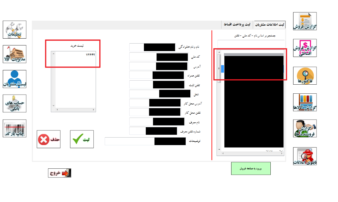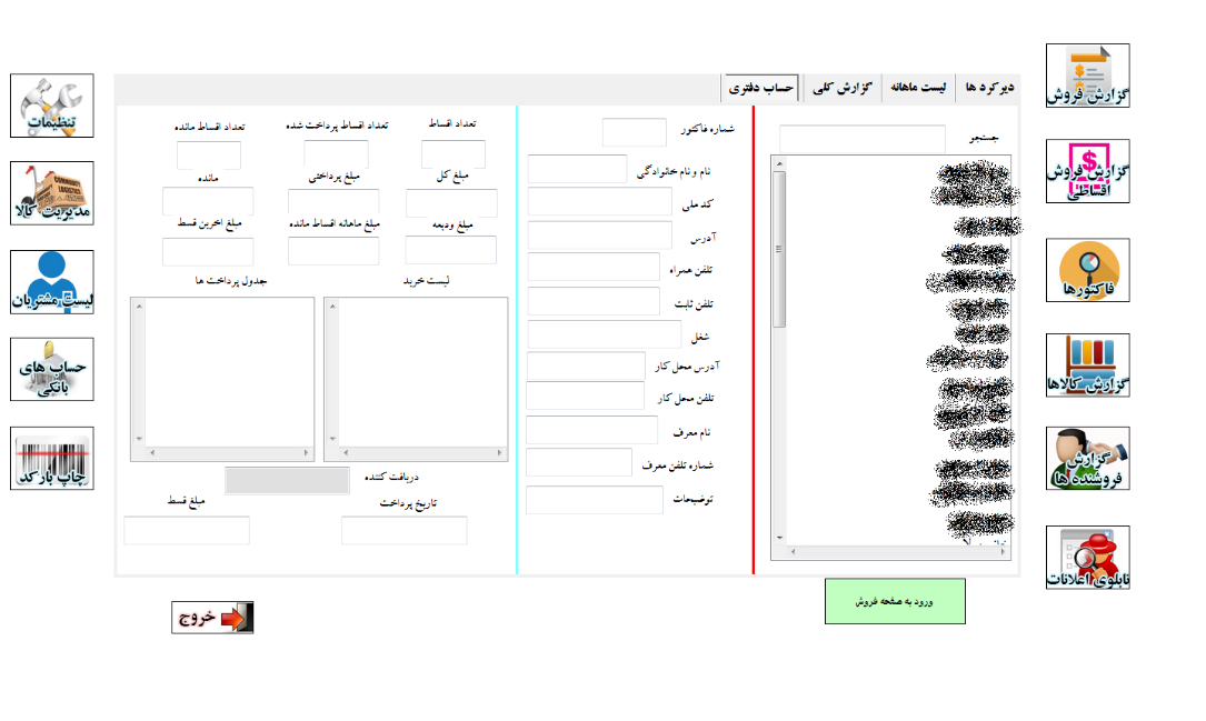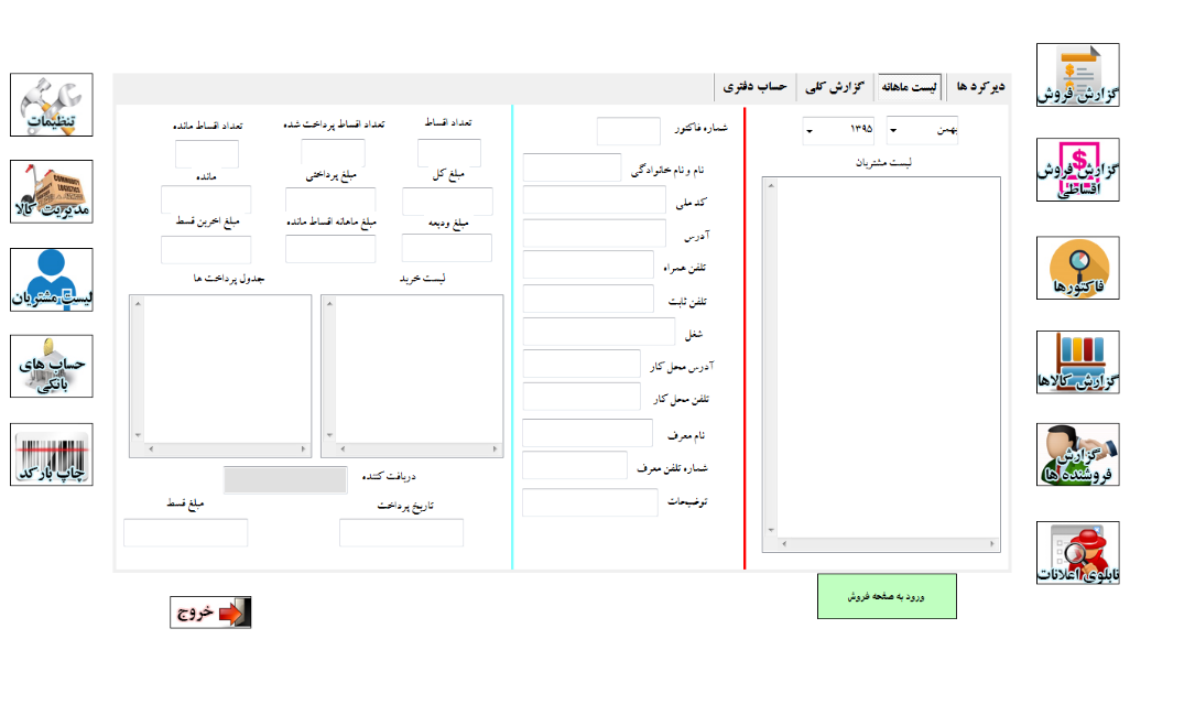 در این صفحه لیست مشتریان که کالای قسطی خریداری کرده اند وارد می شود. اطلاعات را همانند شکل وارد کنید و سپس دکمه ثبت را کلیک کنید. برای ویرایش و یا حذف در قسمت لیست نام مشتریان بر روی نام آنها کپی کرده و برای ویرایش بعد از اعمال تغییرات دکمه ثبت را بزنید و برای حذف دکمه حذف را کلیک نمایید. در قسمت لیست خرید ، شماره فاکتور مشتریان آورده می شود که با کلیک کردن بر روی شماره فاکتور به قسمت ثبت پرداخت اقساط می روید.