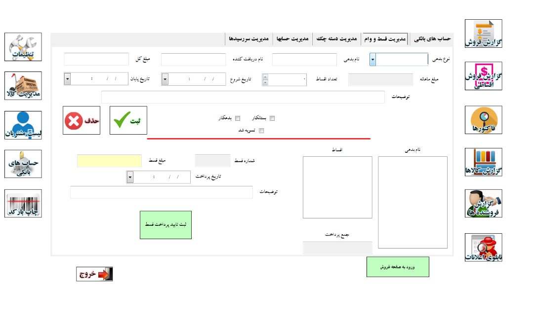 در این صفحه می توان اقساط و وام های خود را همانند شکل تعریف نمود و در تاریخ های مشخص اقساط آن را ثبت نرم افزار کرد.