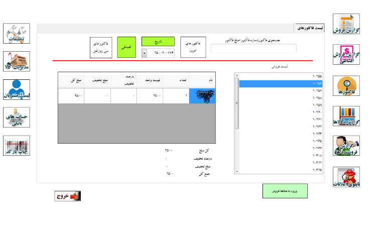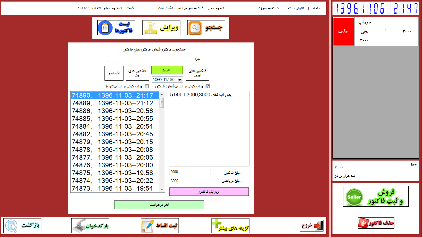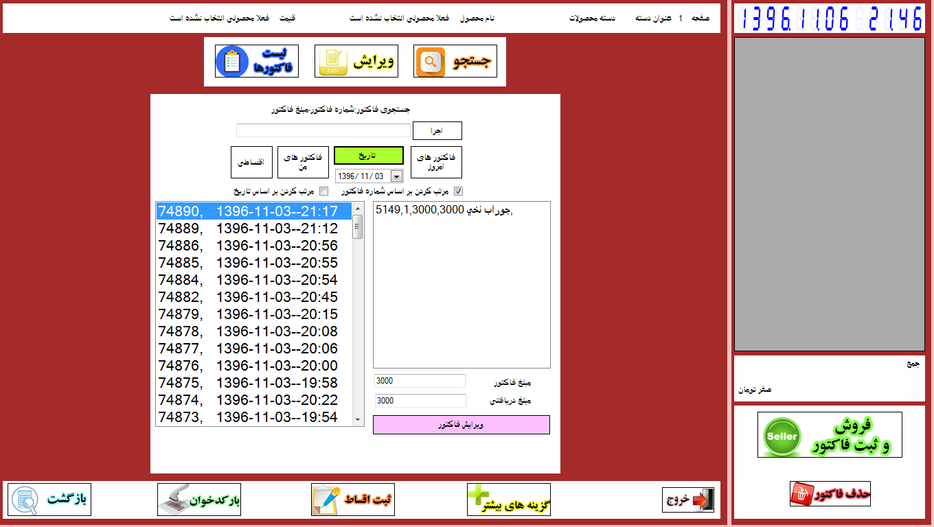 با انتخاب شماره فاکتور لیست کالاهای فاکتور آورده می شود که به وسیله گزینه ویرایش فاکتور می توان فاکتور را ویرایش و یا حذف نمود. بدین صورت که زمانی گزینه ویرایش فاکتور را می زنید همانند یک فاکتور معمولی در نرم افزار ظاهر می شود که با زدن گزینه حذف فاکتور می توان فاکتور را حذف کرد و یا با تغییرات در فاکتور و زدن گزینه فروش ثبت فاکتور و طی نمودن مراحل ثبت فاکتور را ویرایش نمود.