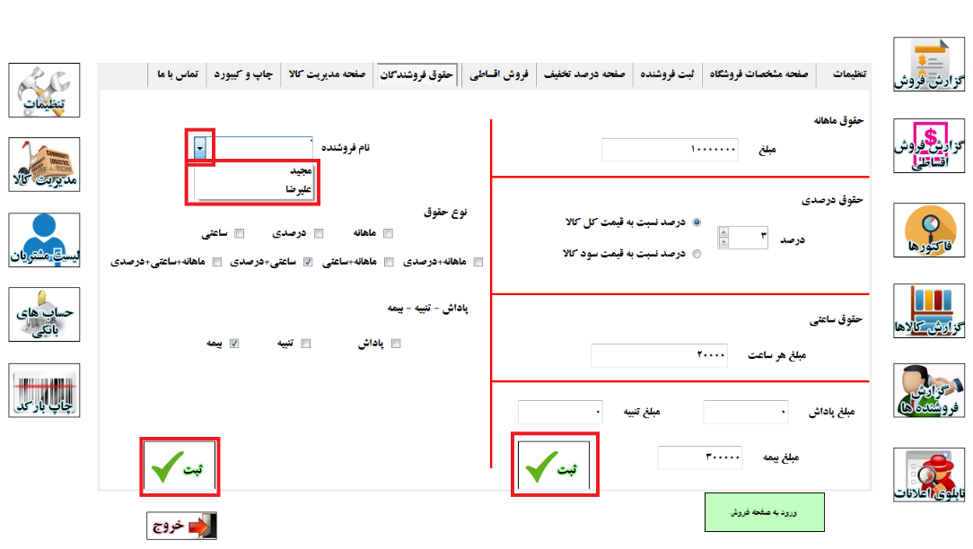 در این صفحه می توانید روش پرداخت حقوق برای فروشنده و مبلغ حقوق را مشخص کنیدو مبلغ حقوق برای همه فروشنده ها ثابت می باشد ولی می توان نوع پرداخت حقوق را تغییر داد لازم به ذکر است در قسمت گزارش فروشنده ها می توان این مبالغ را تغییر داد.