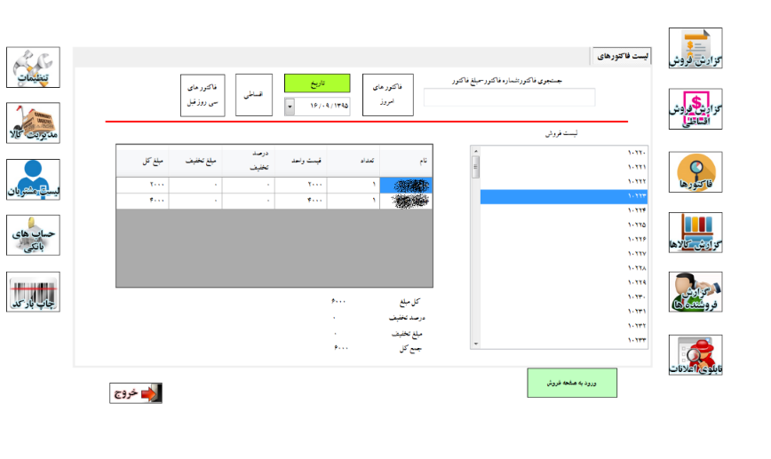 در این صفحه می توان فاکتورها را براساس فاکتورهای امروز و یا تاریخ مشخص و یا فاکتورهای اقساطی و یا فاکتورهای 30 روز گذشته در قسمت لیست فروش نمایش داد در قسمت لیست فروش با کلیک کردن بر روی شماره فاکتور لیست اقلام فروخته شده نمایش داده می شود. همچنین می توان به وسیله جستجو فاکتور خاصی را جستجو نمود.