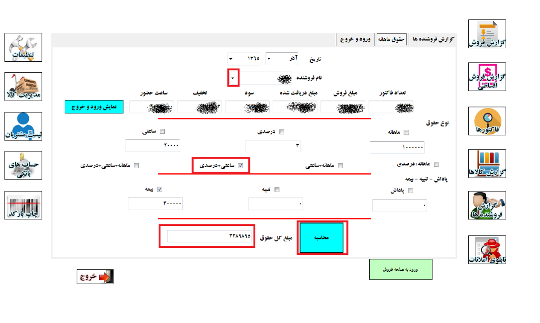در این صفحه با انتخاب ماه و نام فروشنده می توان میزان حقوق ماه آن را مشخص نمود . فرمول پیش فرض محاسبه حقوق در قسمت تنظیمات وارد شده است ولیکن در این صفحه می توان مقادیر آن را تغییر داد و برای محاسبه حقوق بر روی گزینه محاسبه کلیک نمود. در این صفحه با کلیک بر روی نمایش ورود، خروج، تاریخ ورود و خروج به وسیله نرم افزار نمایش داده می شود.