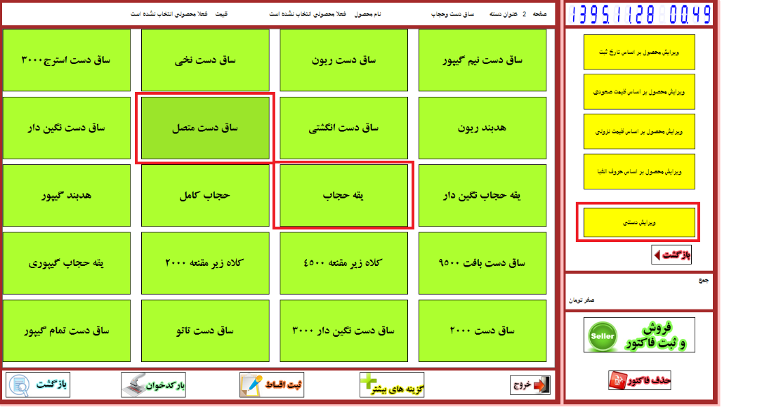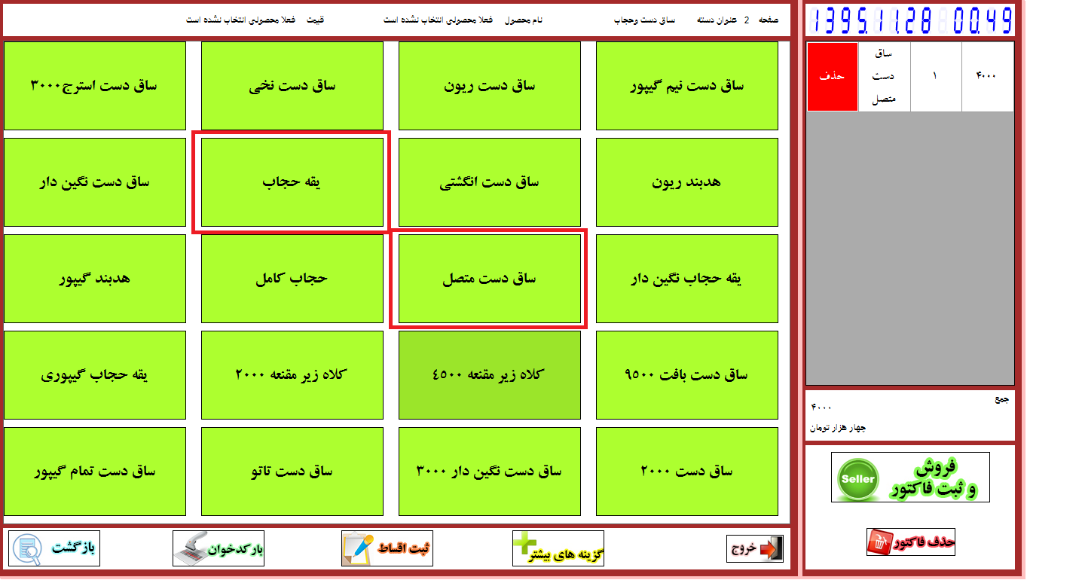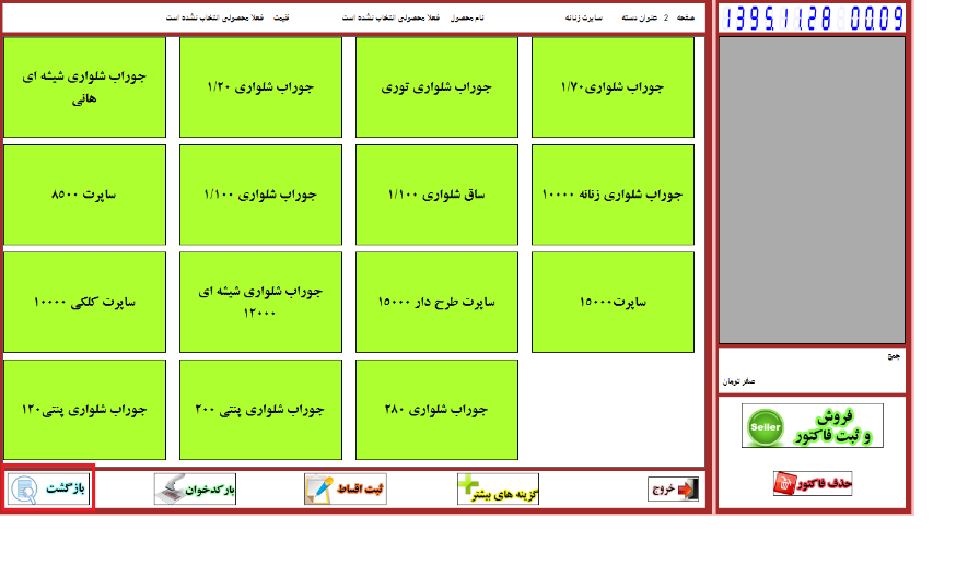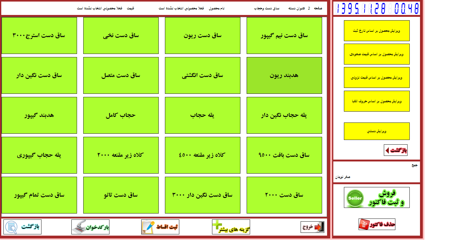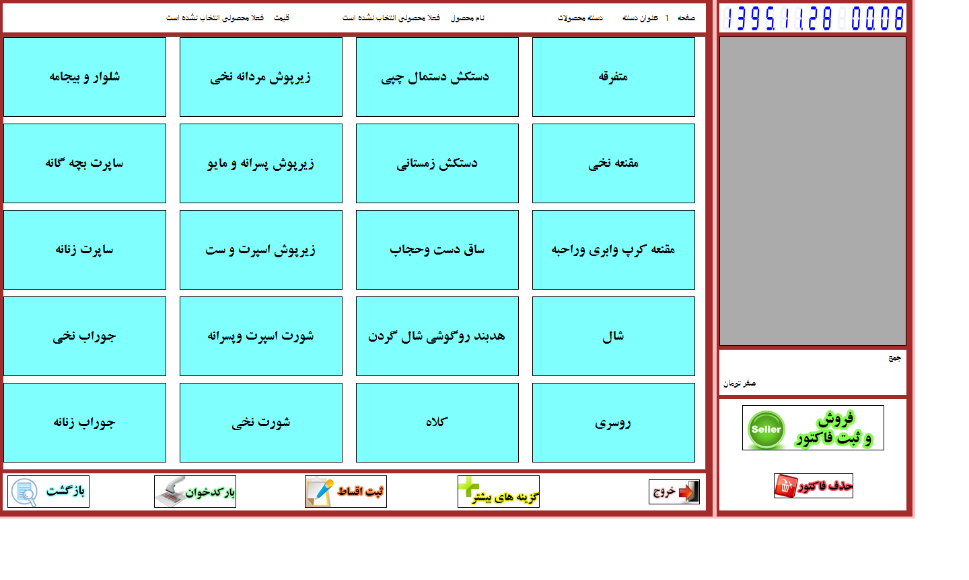 برای انتخاب کالا ابتدا بر روی نام دسته آن کلیک کنید و سپس روی کالای مورد نظر کلیک نمایید. با هر بار کلیک کردن بر روی کالا یک محصول به فاکتور اضافه می شود و از موجودی فروشگاه کم می شود. به وسیله گزینه بازگشت می توان مجدد به صفحه دسته ها برگشت و دسته جدید و محصول جدید را انتخاب کرد.