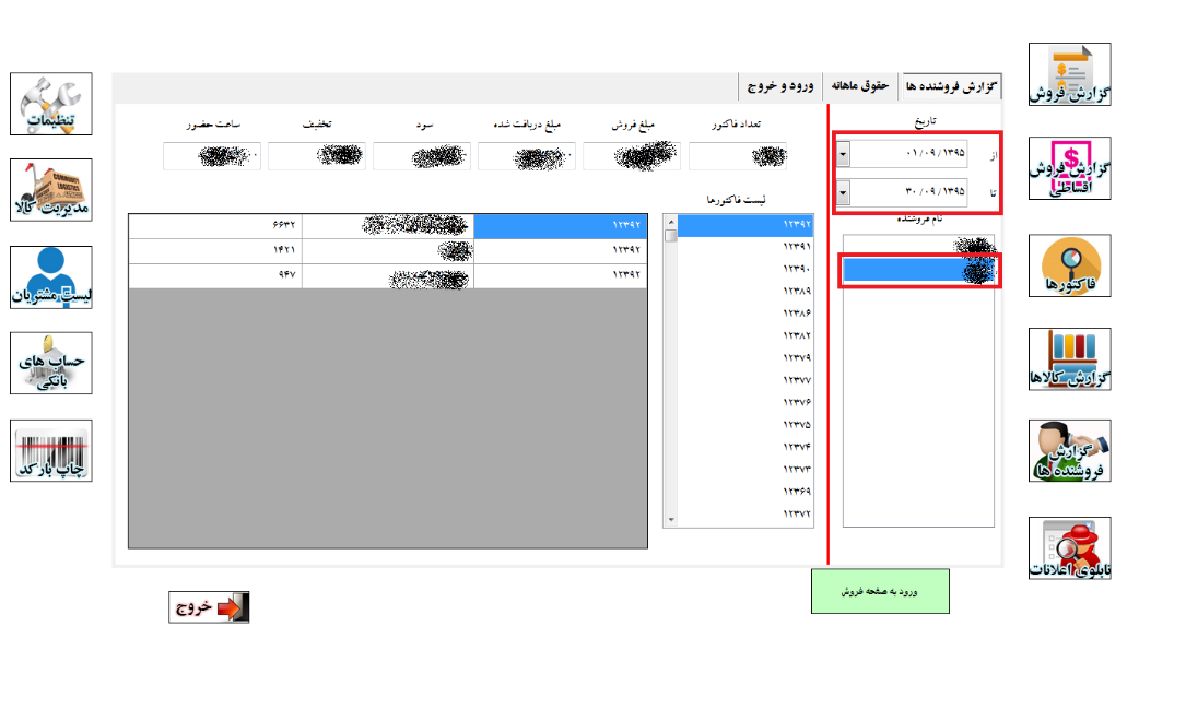 در این صفحه می توان گزارش فروش هر فروشنده را در بازه مشخص همانند شکل مشخص نمود.