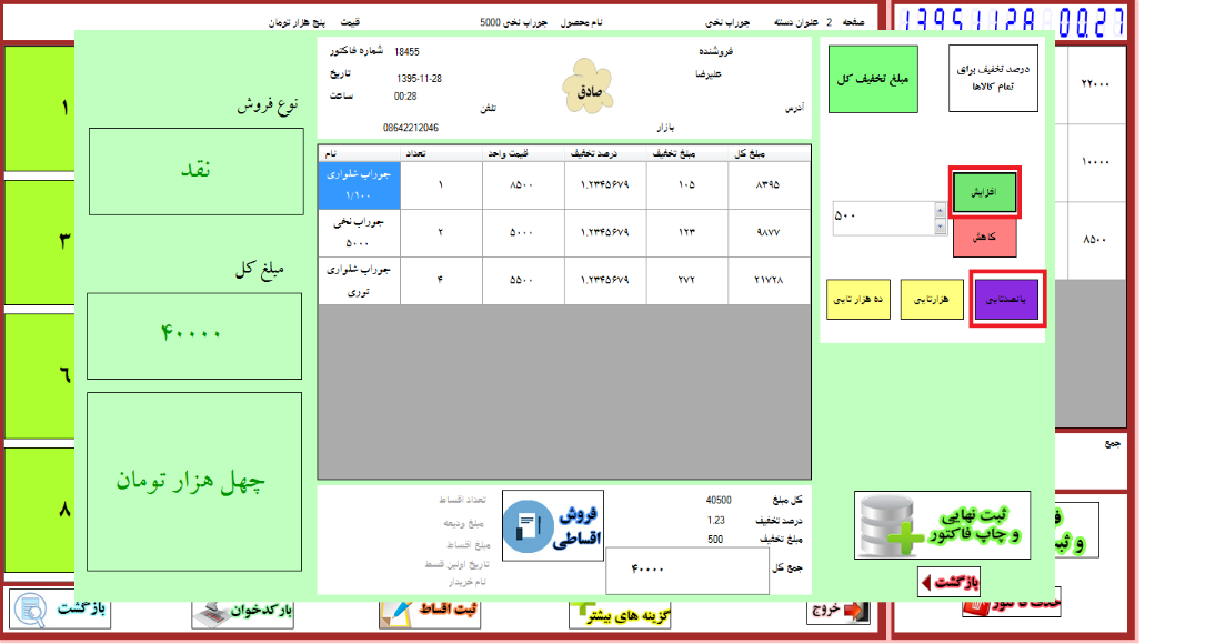 در صفحه تخفیف با انتخاب گزینه های صدتایی، هزارتایی، ده هزار تایی می توان به وسیله دو گزینه افزایش و کاهش اقدام به وارد نمودن مبلغ تخفیف کرد.