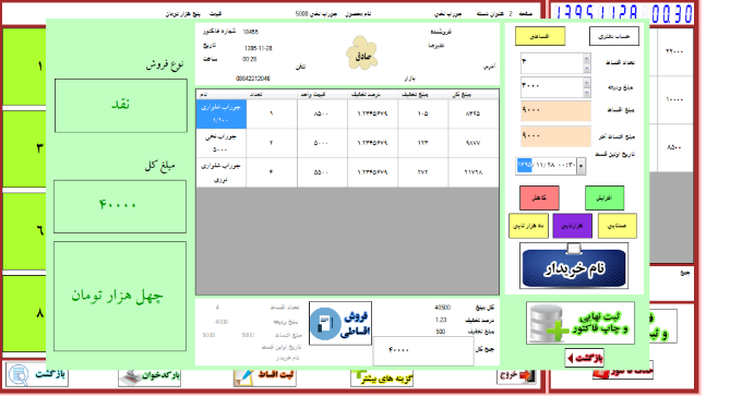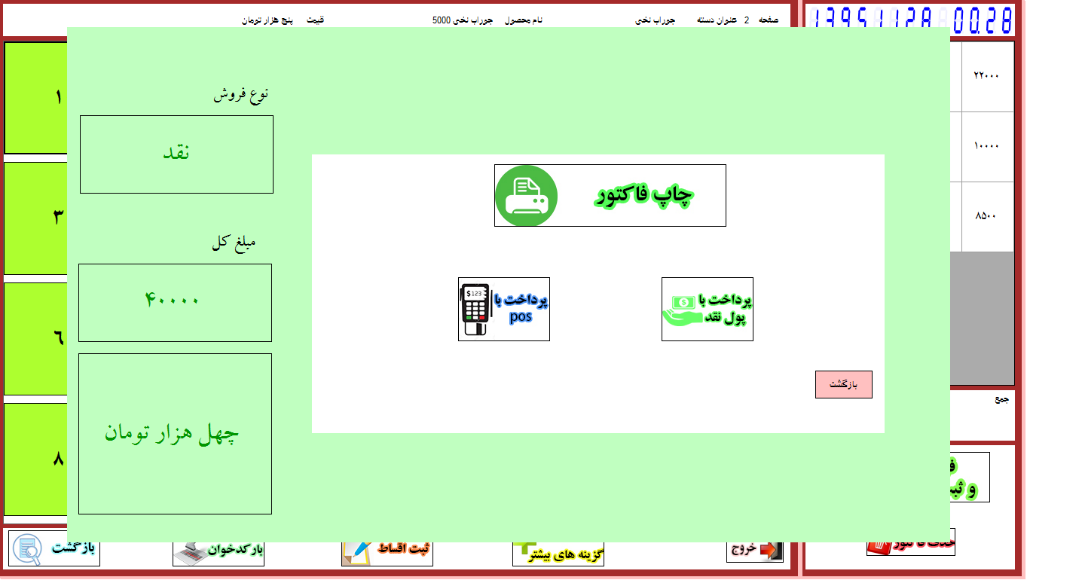 اگر می خواهید فاکتور چاپ شود ابتدا بر روی چاپ فاکتور و سپس بر روی یکی از دو گزینه پرداخت با پول نقد و یا پرداخت با pos کلیک کنید و اگر هم نمی خواهید فاکتور چاپ شود مستقیما بر روی پرداخت با پول نقد و یا پرداخت با pos کلیک کنید.