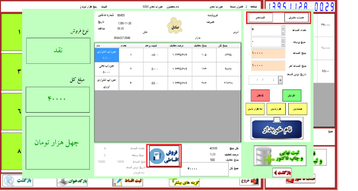 برای فروش اقساطی در صفحه ثبت فاکتور همانند شکل بر روی فروش اقساطی کلیک نمایید. در کادر سمت راست ابتدا نوع فروش را مشخص کنید. ( حساب دفتری یا اقساطی )