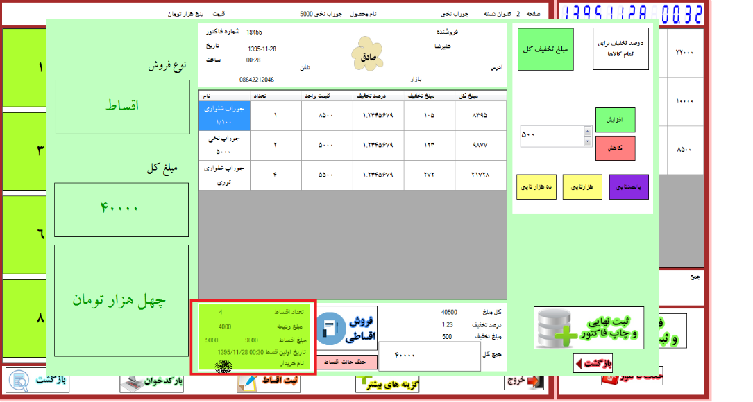 در صفحه ثبت فاکتور به وسیله کادر مشخص شده در تصویر می توان مبلغ تخفیف برای کل اجناس و یا با انتخاب درصد تخفیف برای تمام اجناس تخفیف را وارد نمود. همچنین با کلیک کردن بر روی درصد تخفیف و یا مبلغ تخفیف در جدول فاکتور می توان جداگانه برای هر کالا تخفیف وارد کرد.